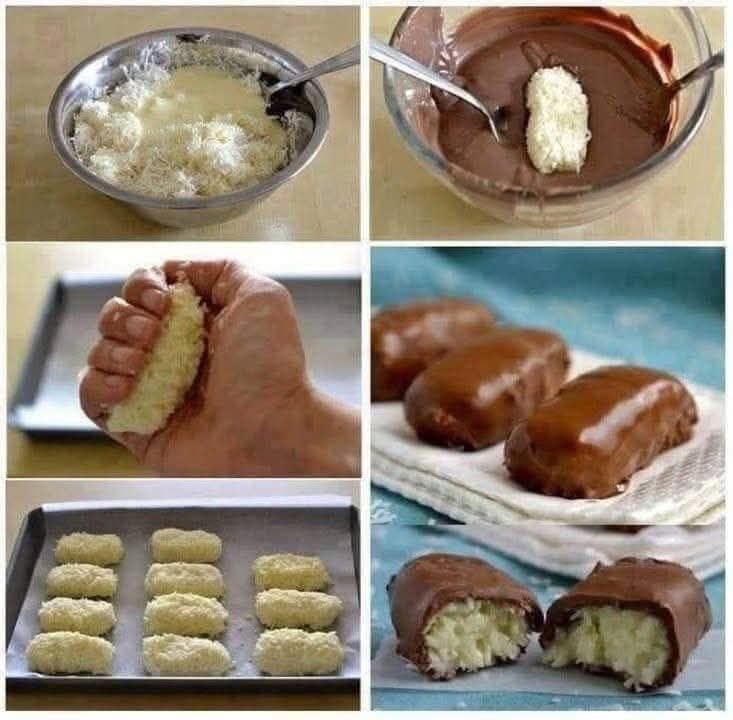 Barres Mounds IngrĂ©dients : 250 g de noix de coco rĂąpĂ©e 125 g de lait concentrĂ© sucrĂ© 250 g de pĂ©pites de chocolat 1 cuillĂšre Ă  soupe d’huile de coco PrĂ©paration :